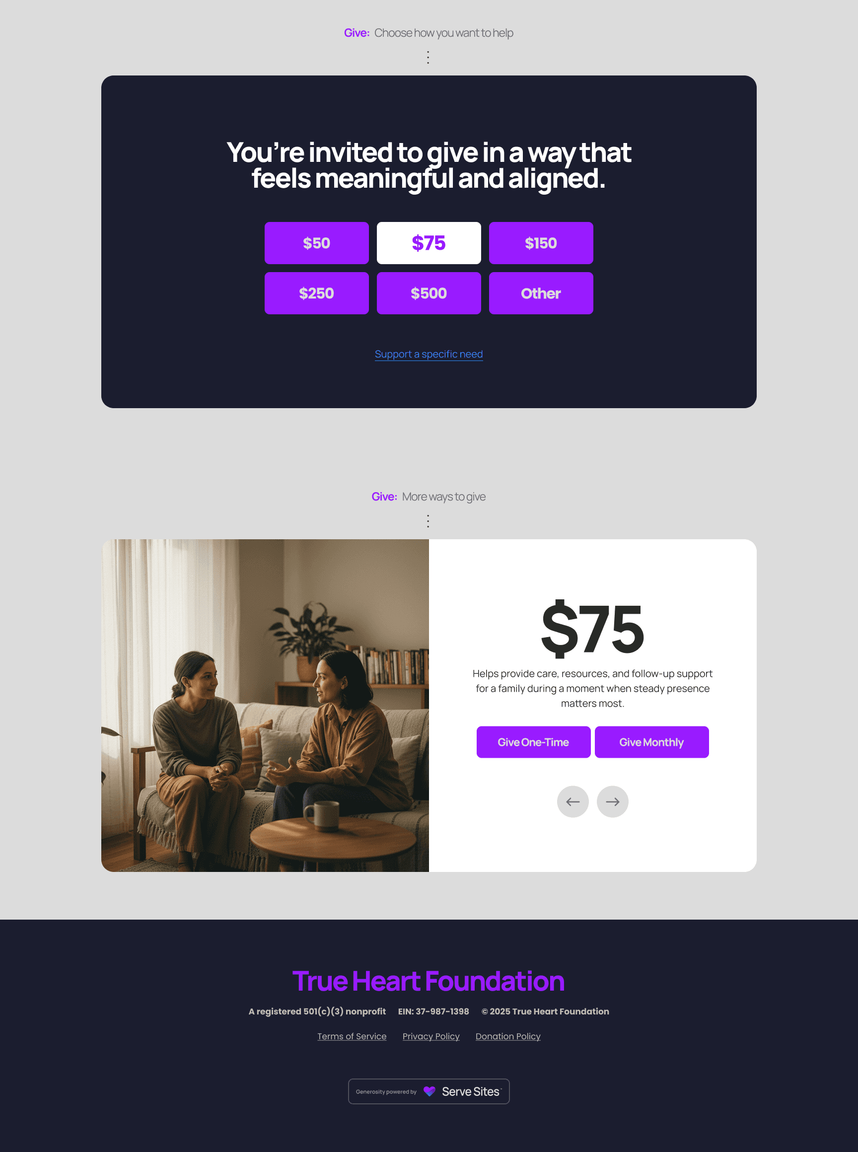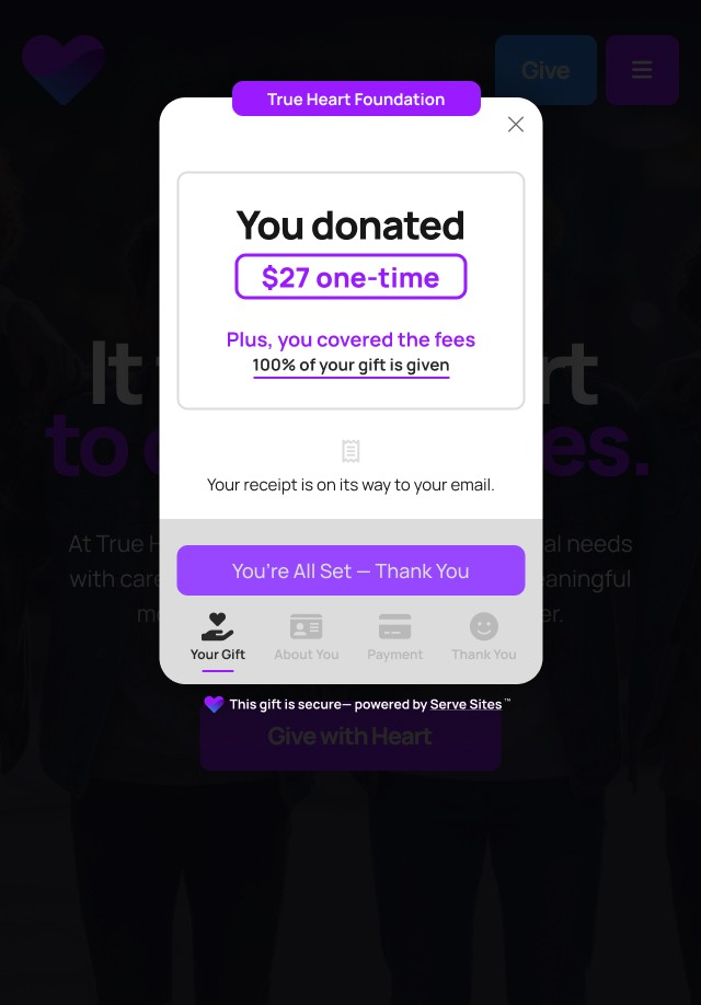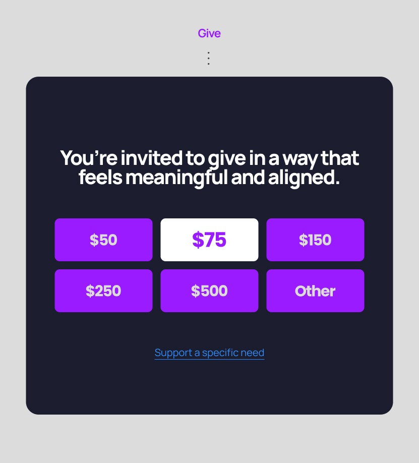 Serve Sites brings generosity into a single, guided flow — where your Generosity Pages and Giving Card work together to create a focused giving experience that leads donors naturally to giving.