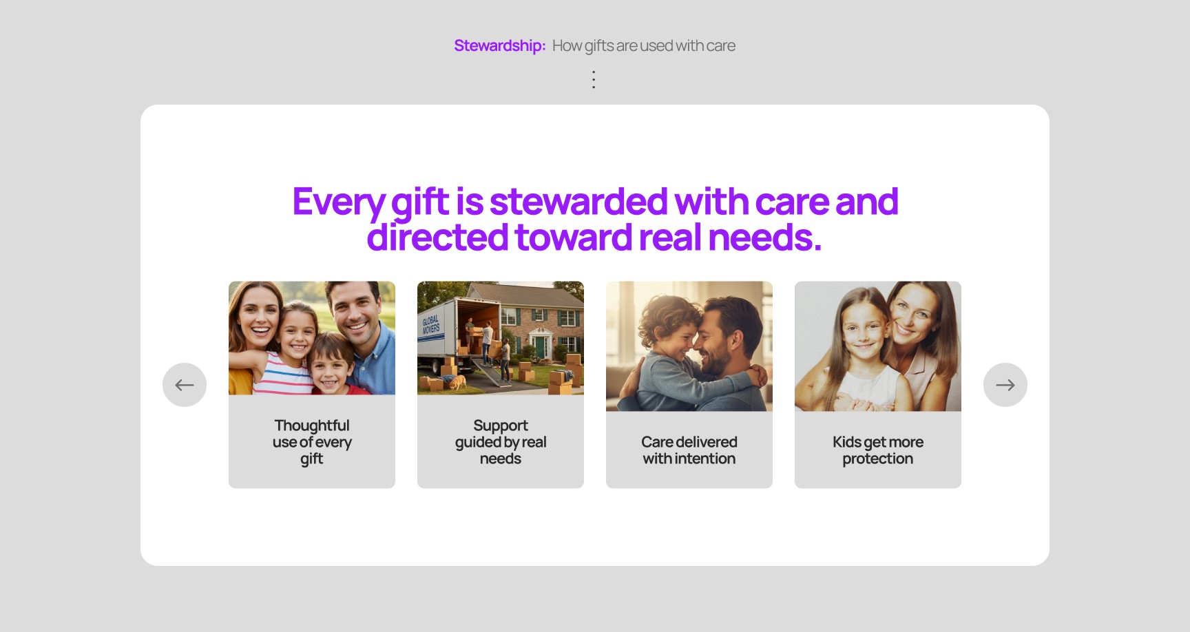 Build trust by demonstrating how gifts are used with care, offering transparency and reassurance through thoughtful messaging and supporting visuals.