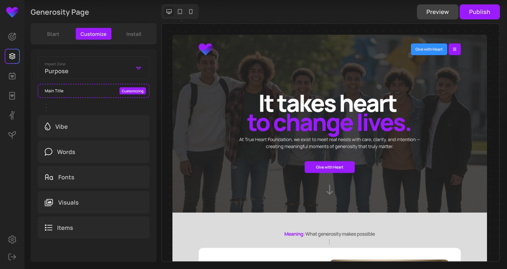 Introduce your mission with clarity and intention, setting the foundation for generosity by communicating what you stand for and why it matters.