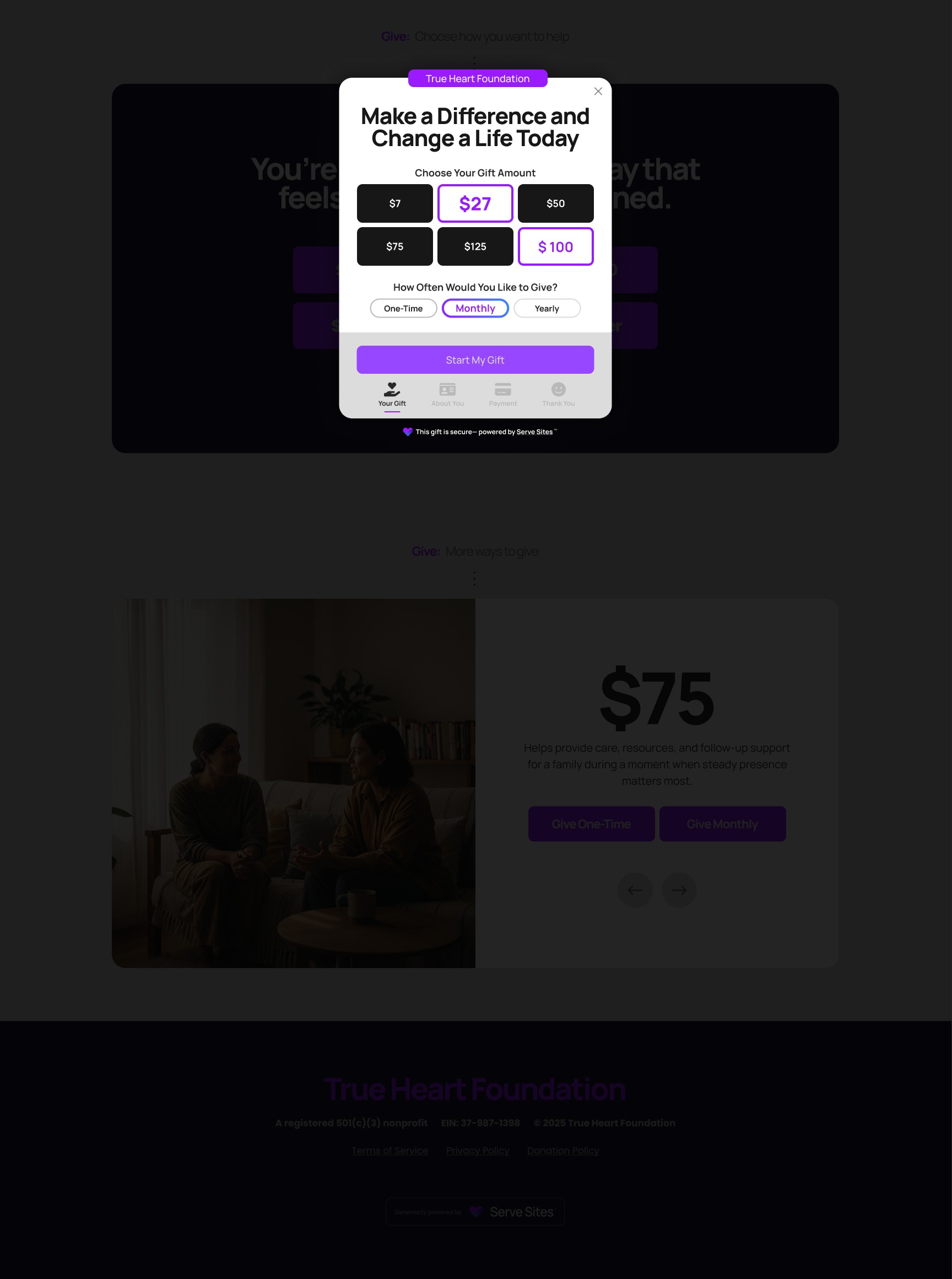 A clear starting point. Donors choose how they want to give — amount and frequency — without distraction or confusion.